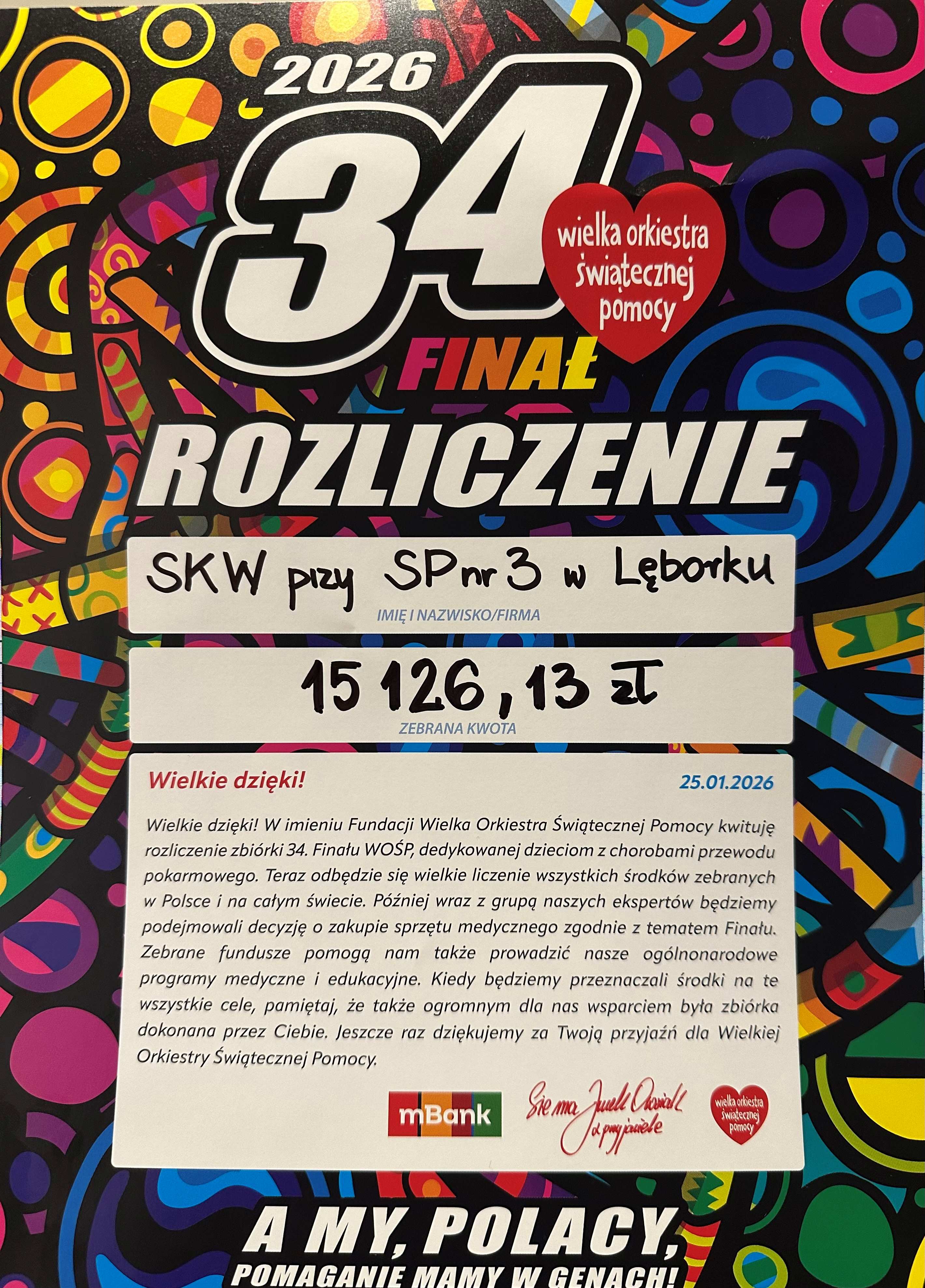 Łącznie na Wielką Orkiestrę Świątecznej Pomocy w 2026 roku wszyscy razem zebraliśmy 15 126,13 zł.