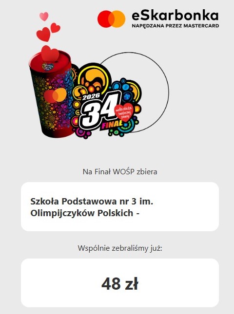 W niedzielę, 25 stycznia 2026 roku podsumowaliśmy akcję WOŚP, która zorganizowana była w naszej szkole od 7 stycznia 2026 roku. Wolontariusze Szkolnego Koła Wolontariatu przy SP3 codziennie częstowali słodkimi wypiekami społeczność szkolną, która chętnie wrzucała pieniądze do dwóch puszek stacjonarnych WOŚP. Efektem tych działań była zebrana kwota w wysokości 1 597,91 zł do puszek stacjonarnych.