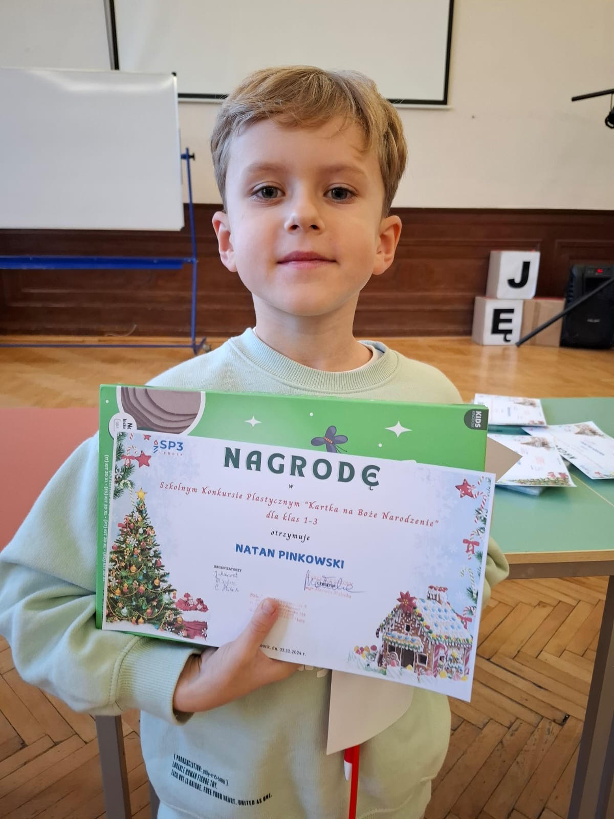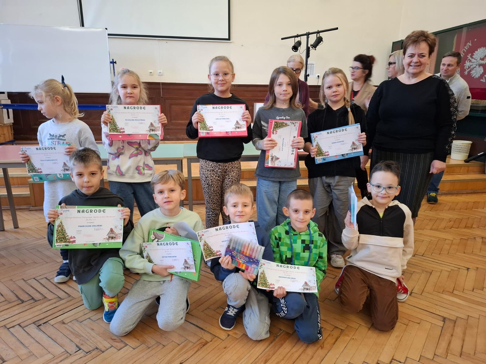 Tego dnia odbyło się także wręczenie nagród za konkursy, które odbyły się w pierwszym semestrze. Nagrodzeni uczniowie otrzymali dyplomy oraz drobne upominki, a na ich twarzach malowało się ogromne zadowolenie i duma. Cała społeczność szkolna nagrodziła zwycięzców gromkimi brawami, podkreślając ich zaangażowanie i kreatywność.