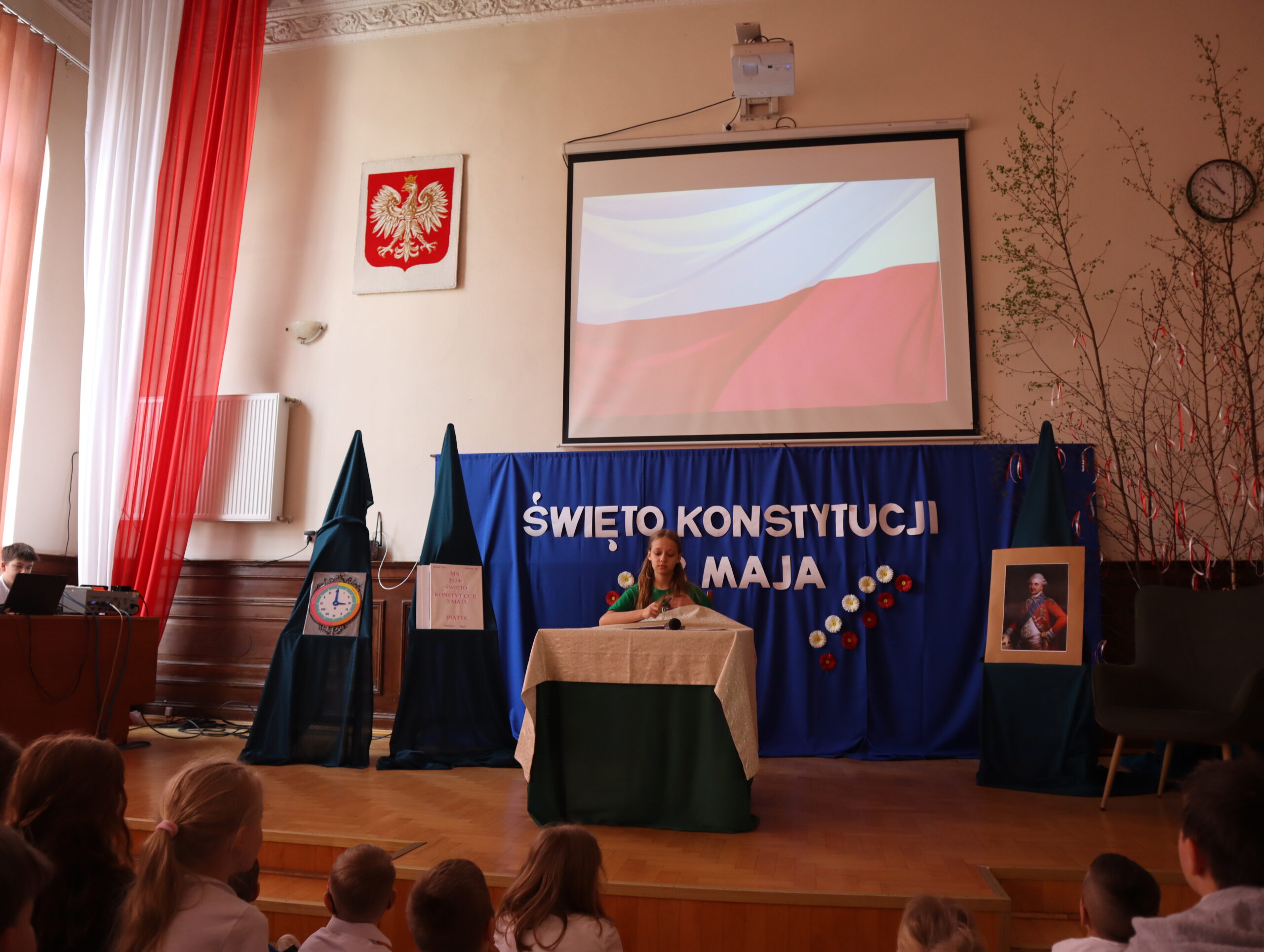 Ania stanęła przed trudnym zadaniem. W wypracowaniu musiała wykazać się wiedzą dotyczącą czasów Rzeczpospolitej szlacheckiej. Z pomocą przyszedł chochlik. Cofając wskazówki zegara i przekładając kartki w kalendarzu, przeniósł dziewczynkę i widzów do czasów panowania Stanisława Augusta Poniatowskiego. Z kart historii dowiedzieliśmy się o trudnej sytuacji politycznej (rozbiory Polski) oraz sukcesach Sejmu Wielkiego. Jako Polacy jesteśmy dumni z uchwalenia pierwszej w Europie konstytucji – Konstytucji 3 maja, która wniosła wiele korzystnych zmian. Teraz napisanie wypracowania poszło Ani jak z płatka. Apel, zakończony pieśnią „Witaj, majowa jutrzenko”, przygotowali uczniowie klasy 5m pod kierunkiem nauczycielek – Marioli Łagody-Ellwart i Mirosławy Wojciechowicz.